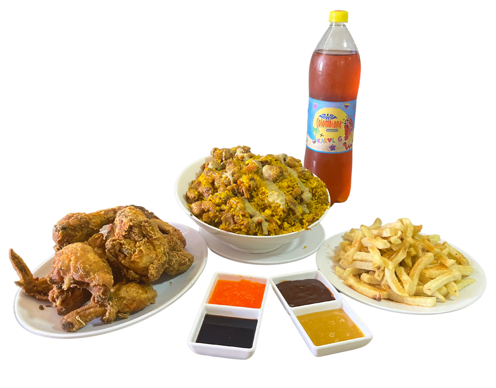 Arroz paisa, 1 pollo, papas a la francesa y gaseosa 1.5 Lt